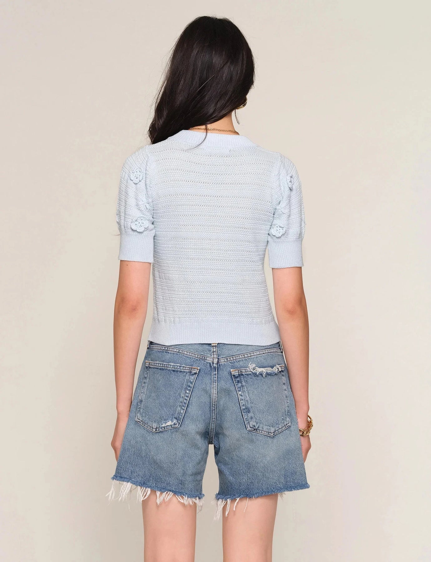 The Cruz Top is a soft, crew neck knit. It features a textured stitch throughout and crochet flowers across the top.